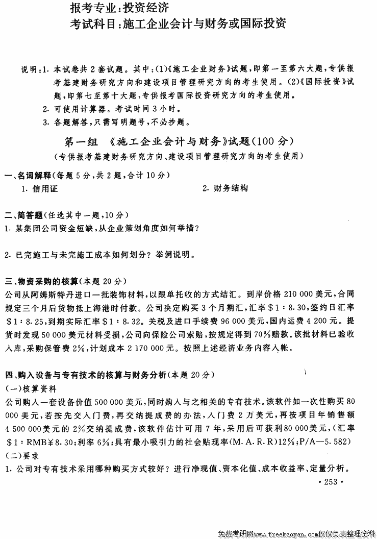 上海财经大学1997年半岛在线注册真题-施工企业会计与财务或国际投资