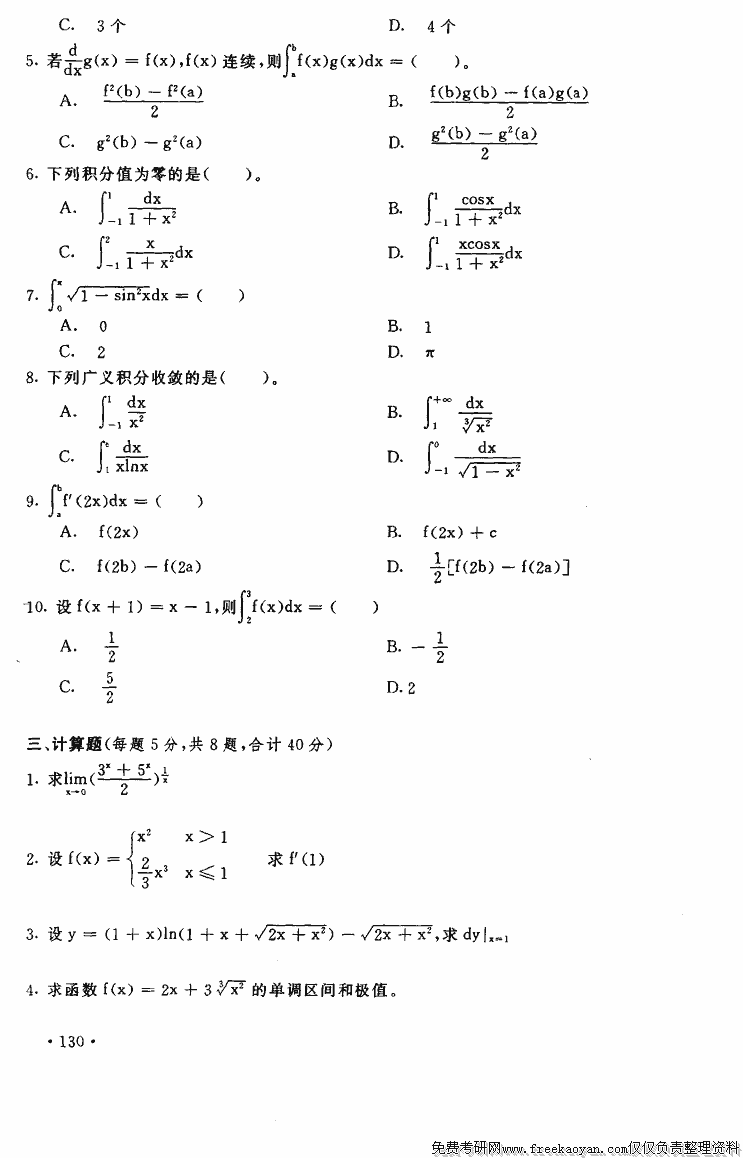 上海财经大学1996年半岛在线注册真题-高等数学一元微积分