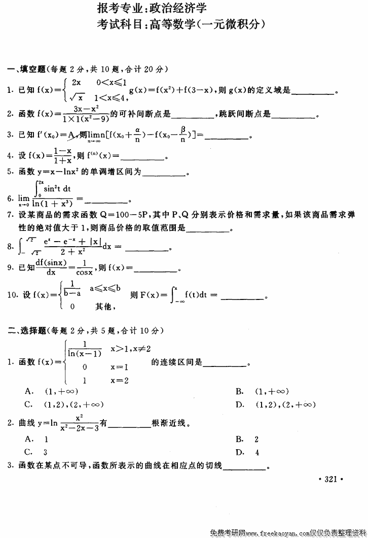上海财经大学1998年半岛在线注册真题-高等数学一元微积分