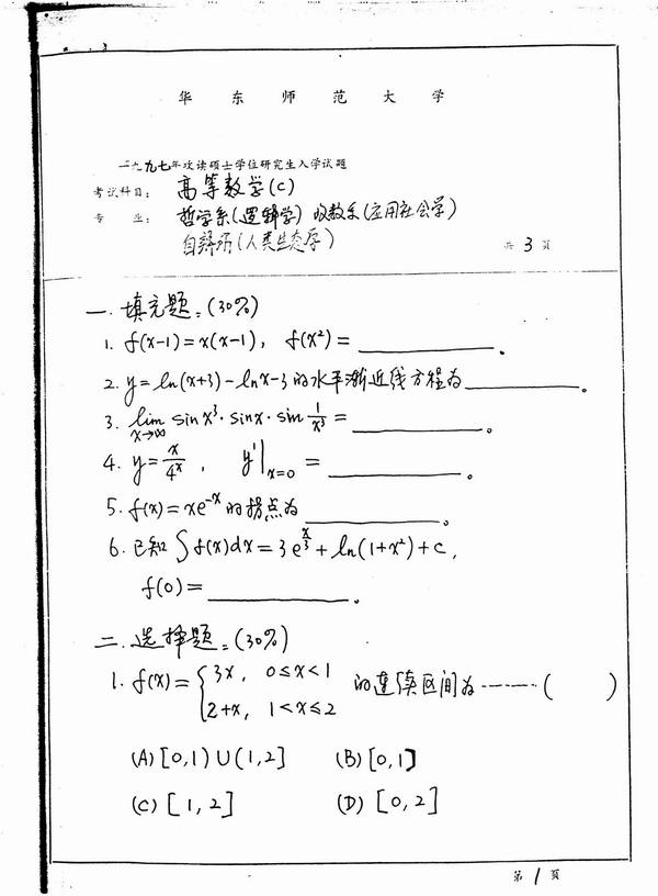 华东师范大学1997年半岛在线注册真题-高等数学-C