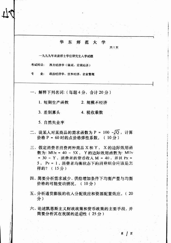 华东师范大学1999年半岛在线注册真题-西方经济学