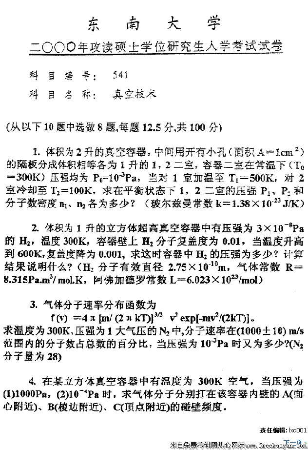 东南大学2000年半岛在线注册真题-真空技术