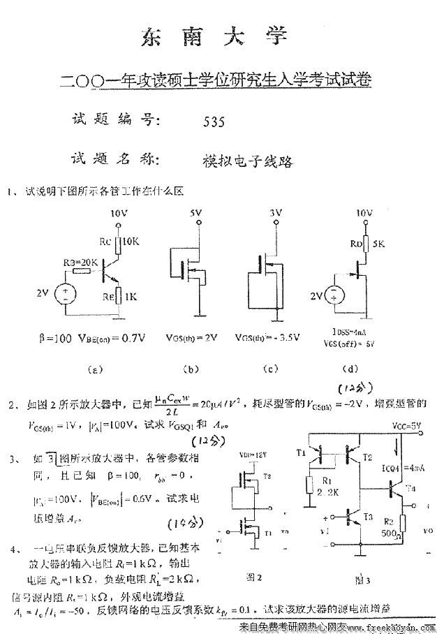 东南大学2001年半岛在线注册真题-模拟电子线路