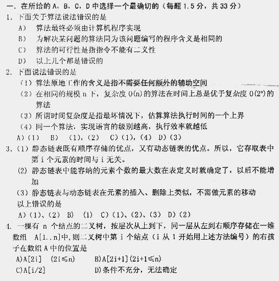 一:回答下列问题(共46分)1.线性表(a(1),a(2),……a(n))用顺序映射表示时,a(i)与a(i+1)(1<=i2.一棵前序序列为1,2,3,4的二叉树,其中序序列可能是4,1,2,3吗?设一棵二叉树的前序序列为1,2,3,4,5,6,7,8,9,其中序序列为2,3,1,5,4,7,8, ...专业课半岛在线注册经验 本站小编 FreeKaoyan 2018-01-22东南大学1997年半岛在线注册真题-操作系统试题