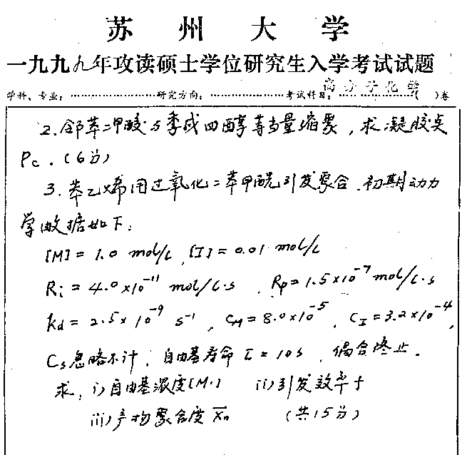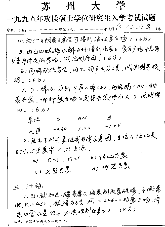 苏州大学1999年半岛在线注册真题-高分子化学