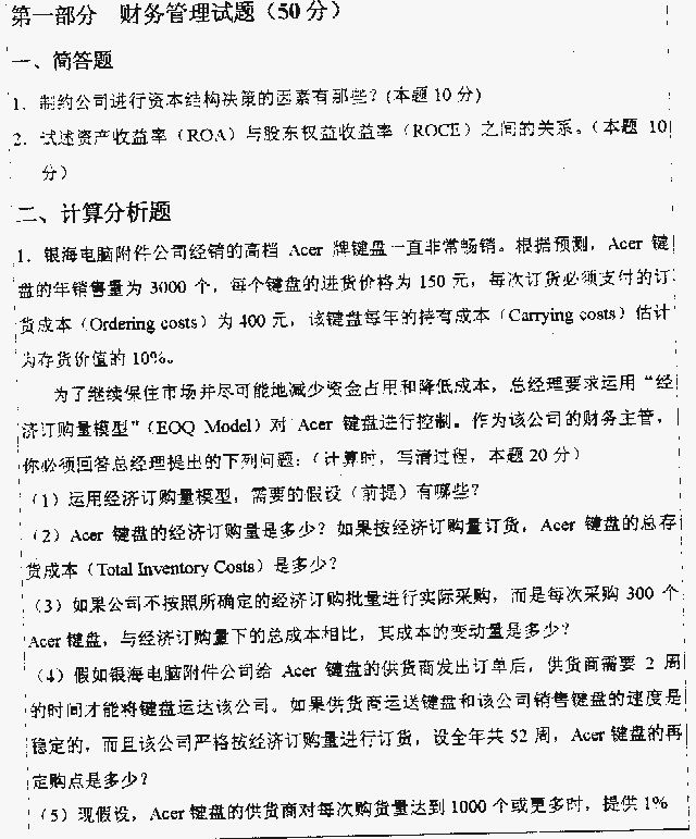 一、简答下述问题(26分)1.(5分)3MV公司拟向银行借款10亿元人民币,期限为3年。3H银行可提年单利为8.75%的贷款,而3F银行可提供每半年计息一次的年利率为8%的复利贷款。两种贷款均于期末一次还本付息。问3MN公司接受哪家银行贷款,为什么?2.(5分)什么是财务杠杆?说明权益回报率的财务杠 ...