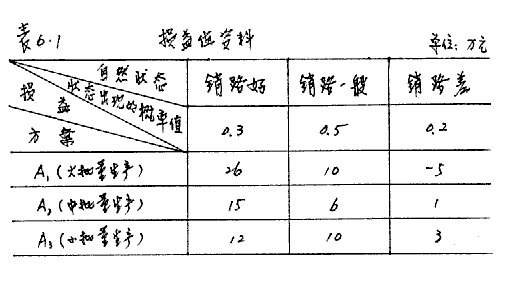 6、某工厂要确定下一计划期内产品的生产批量。经预测分析,认为产品销路好、一般、差三种情况的概率分别为0.3、0.5、0.2,现有大、中、小三种生产批量计划,有关损益值资料如表6.1所示,试作出决策树图,并决策应选用哪一个方案。