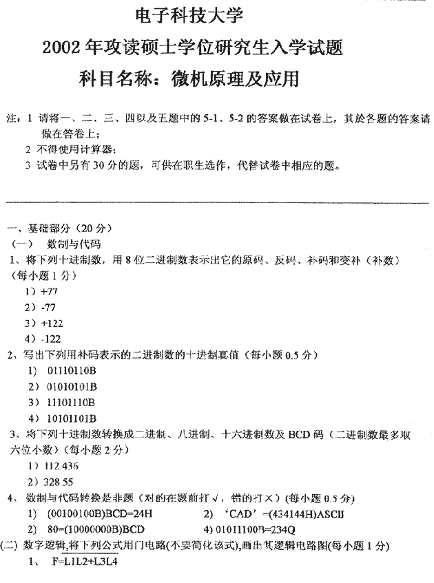 专业课半岛在线注册经验 本站小编 FreeKaoyan 2018-01-22电子科大1999微机原理与数字电路试题 考试科目:微机原理与数字电路 注:应届生作所有不加*的题,往届生可在加*号题与同序号不加*号题中任选一题。 一、单项选择题(共10分)从每小题的四个备选答案中,选出一个正确答案,并将正确答案的番号填入题干的括号内。 1、 从8086CPU的内部结构上看,其是由 ...
