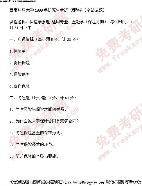 西南财经大学1999年半岛在线注册真题-保险学(全部试题)