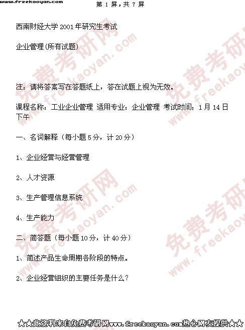 西南财经大学2001年半岛在线注册真题-企业管理(所有试题)