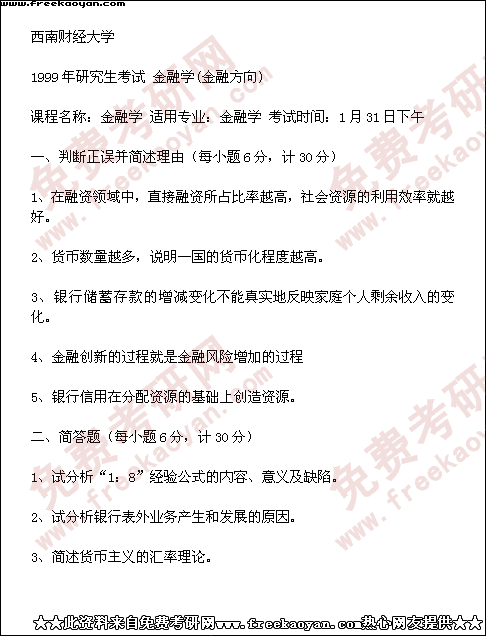 西南财经大学1999年半岛在线注册真题-金融学(金融方向)
