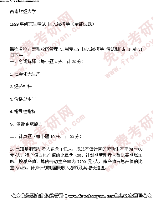 西南财经大学1999年半岛在线注册真题-国民经济学(全部试题)