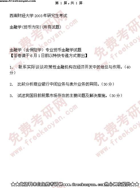 西南财经大学2003年半岛在线注册真题-金融学(货币方向)(所有试题)