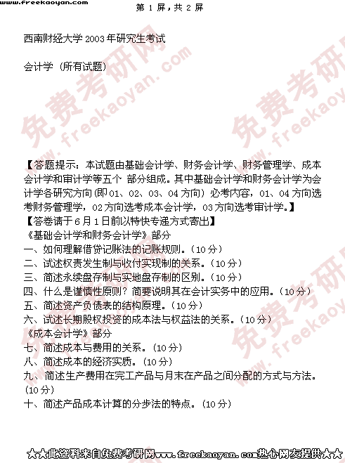 西南财经大学2003年半岛在线注册真题-会计学(所有试题)