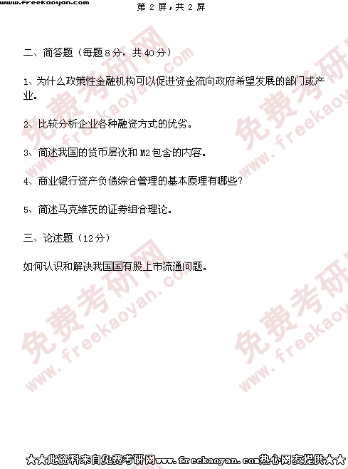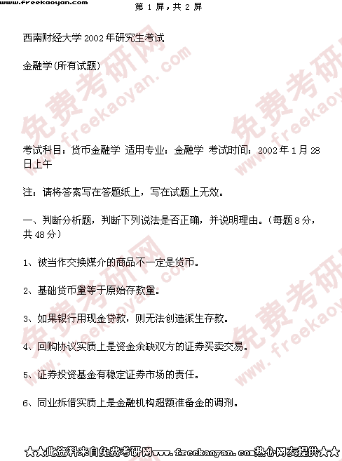 西南财经大学2002年半岛在线注册真题-金融学(所有试题)