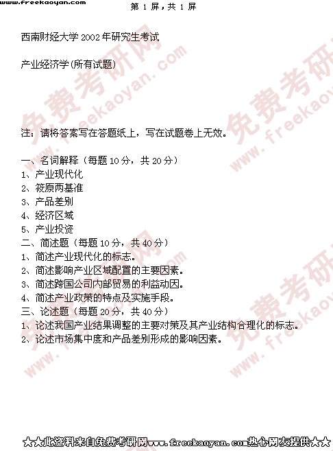 西南财经大学2002年半岛在线注册真题-产业经济学(所有试题)