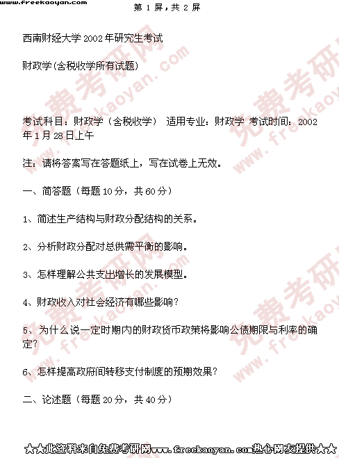 西南财经大学2002年半岛在线注册真题-财政学(含税收学所有试题)