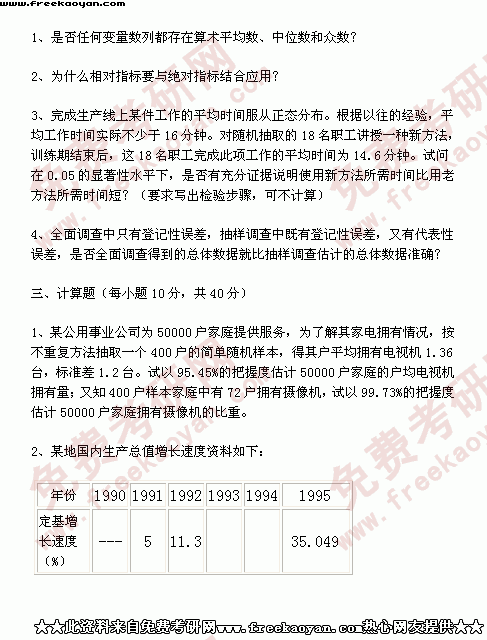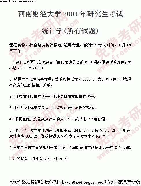 西南财经大学2001年半岛在线注册真题-统计学(所有试题)