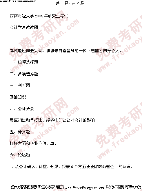 西南财经大学2005年半岛在线注册真题-会计学复试试题