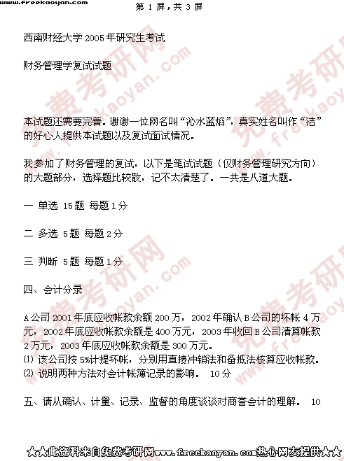 西南财经大学2005年半岛在线注册真题-会计学复试试题
