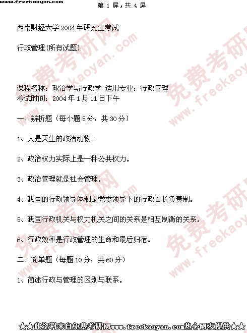 西南财经大学2004年半岛在线注册真题-行政管理(所有试题)