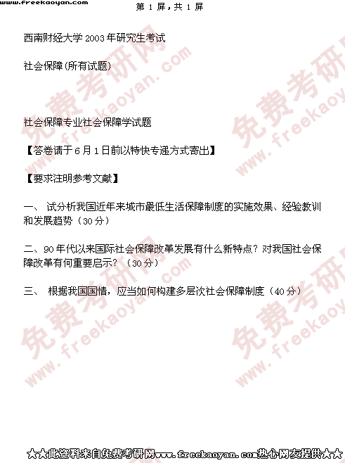 西南财经大学2003年半岛在线注册真题-社会保障(所有试题)