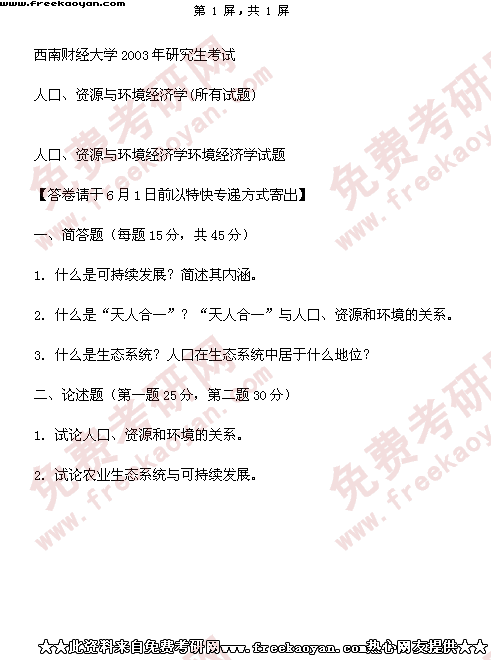 西南财经大学2003年半岛在线注册真题-人口、资源与环境经济学(所有试题)