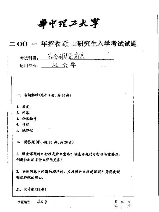 华中科技大学2001年半岛在线注册真题-社会调查方法