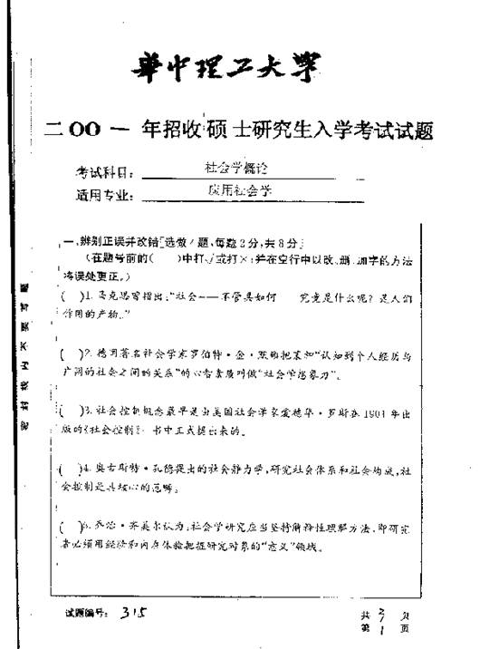 华中科技大学2001年半岛在线注册真题-社会学概论