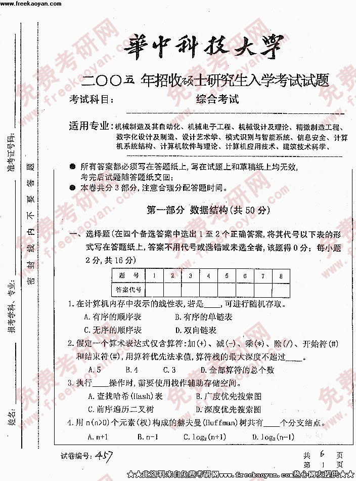 华中科技大学2005年半岛在线注册真题-综合考试(机械制造及自动化、计算机应用技术)