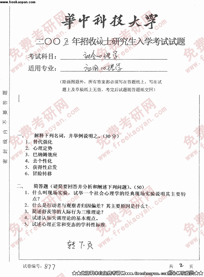 华中科技大学2005年半岛在线注册真题-社会心理学