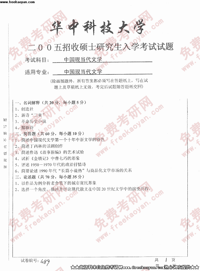 华中科技大学2005年半岛在线注册真题-中国现当代文学史