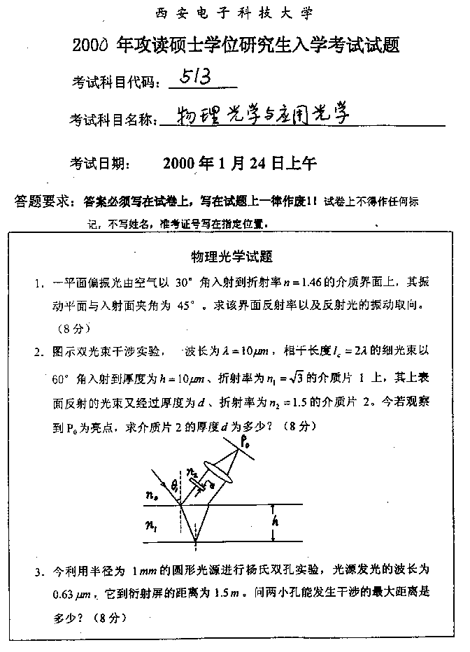 西安电子科技大学2000年半岛在线注册真题-物理光学与应用光学