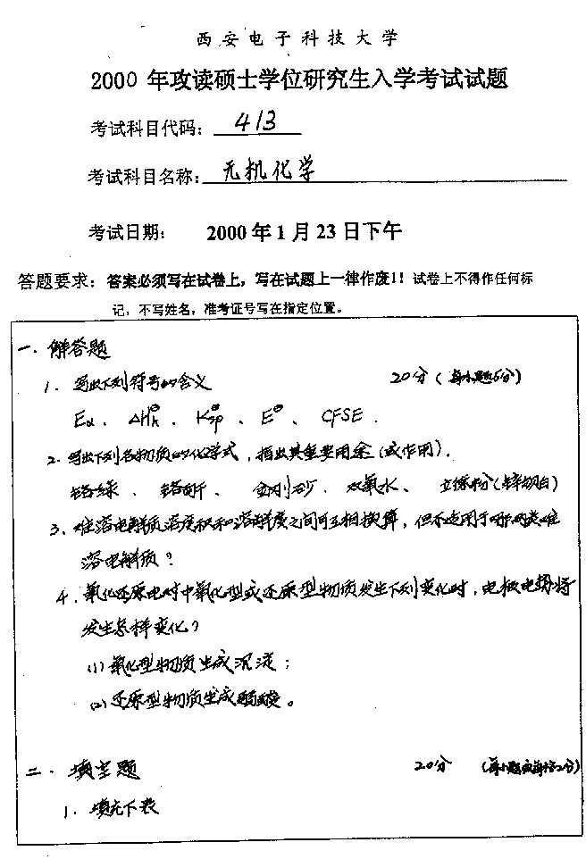 西安电子科技大学2000年半岛在线注册真题-无机化学