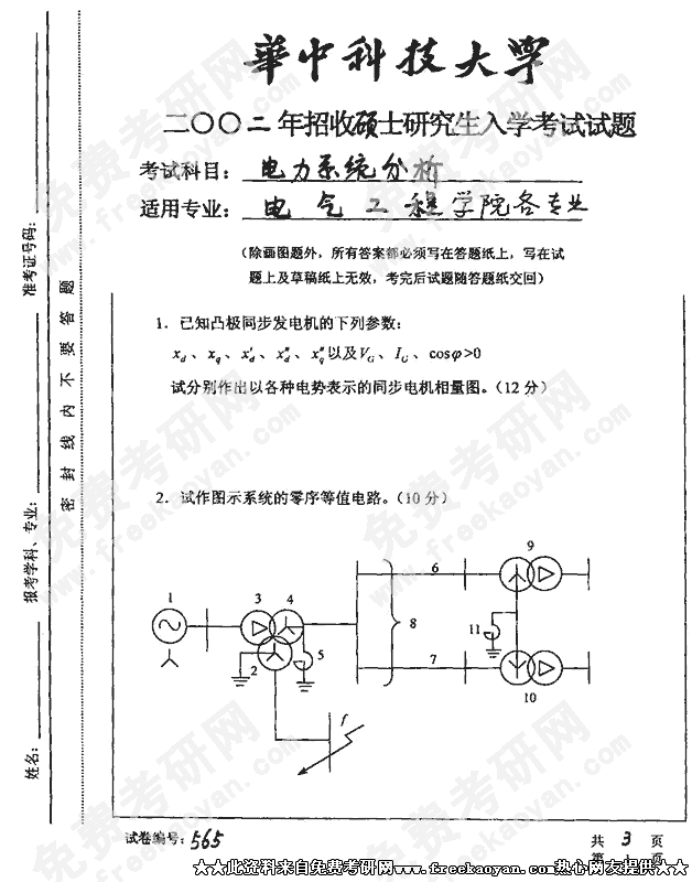 华中科技大学2002年半岛在线注册真题-电力系统分析
