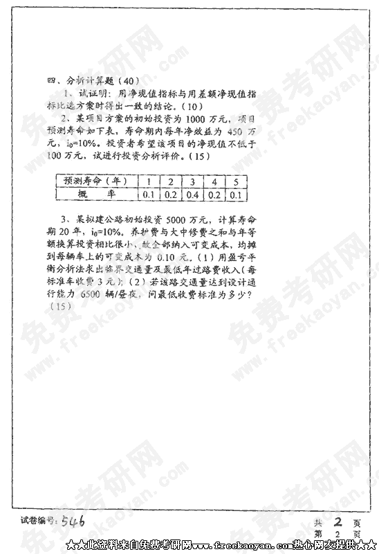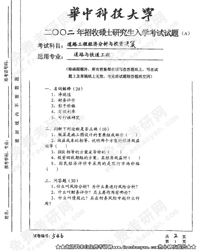 华中科技大学2002年半岛在线注册真题-道路工程经济分析与投资决策