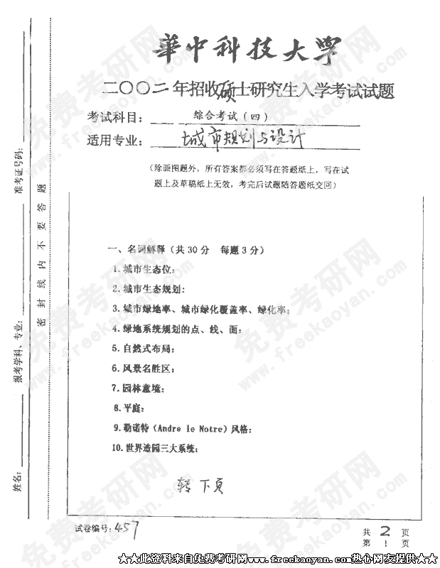 华中科技大学2002年半岛在线注册真题-城市规划与设计综合考试(四)