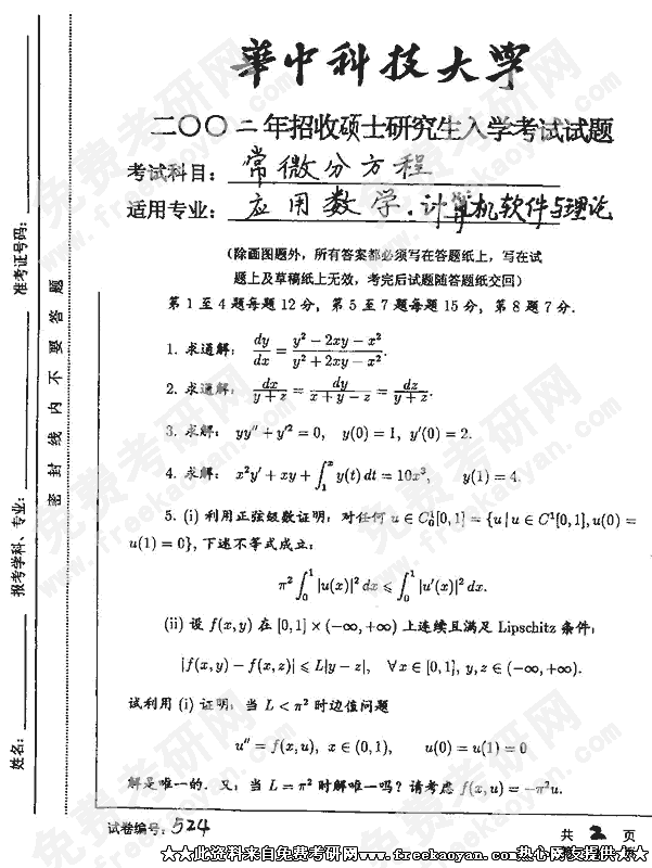 华中科技大学2002年半岛在线注册真题-常微分方程