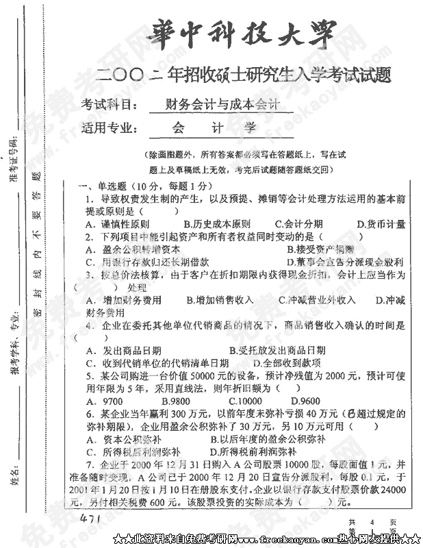 华中科技大学2002年半岛在线注册真题-财务会计与成本会计