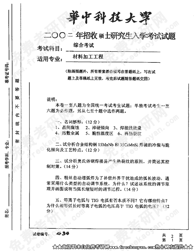 华中科技大学2002年半岛在线注册真题-材料加工工程综合考试