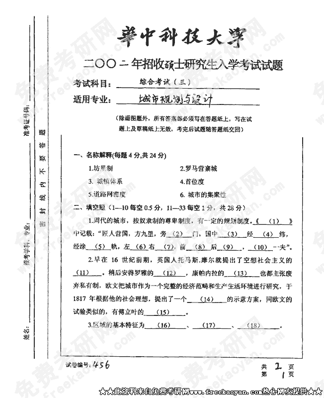 华中科技大学2002年半岛在线注册真题-城市规划与设计综合考试(三)