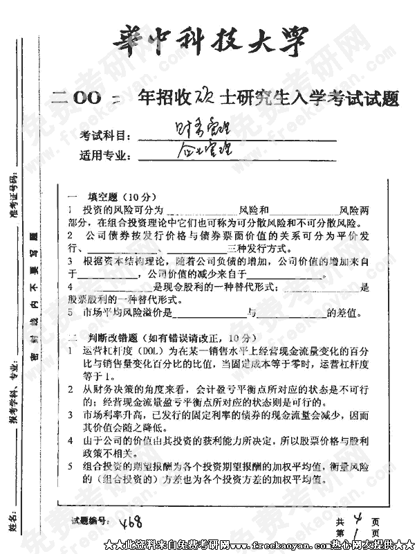 华中科技大学2002年半岛在线注册真题-财务管理与管理会计