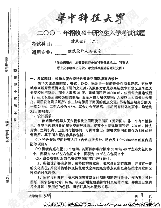 华中科技大学2002年半岛在线注册真题-建筑设计(二)