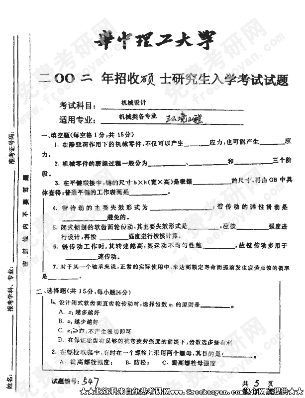 华中科技大学2002年半岛在线注册真题-机械设计基础