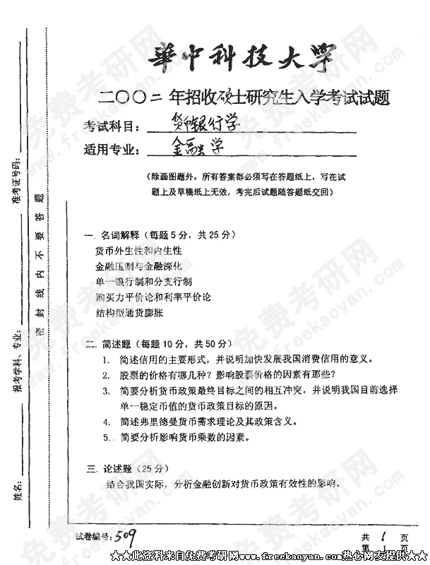 华中科技大学2002年半岛在线注册真题-货币银行学