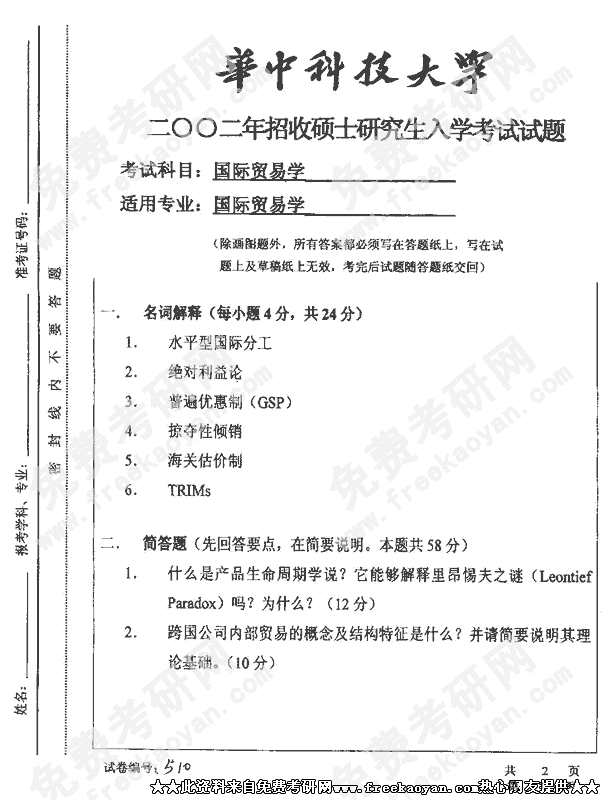 华中科技大学2002年半岛在线注册真题-国际贸易学