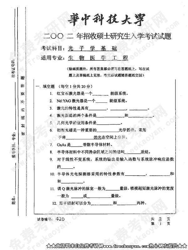 华中科技大学2002年半岛在线注册真题-光子学基础