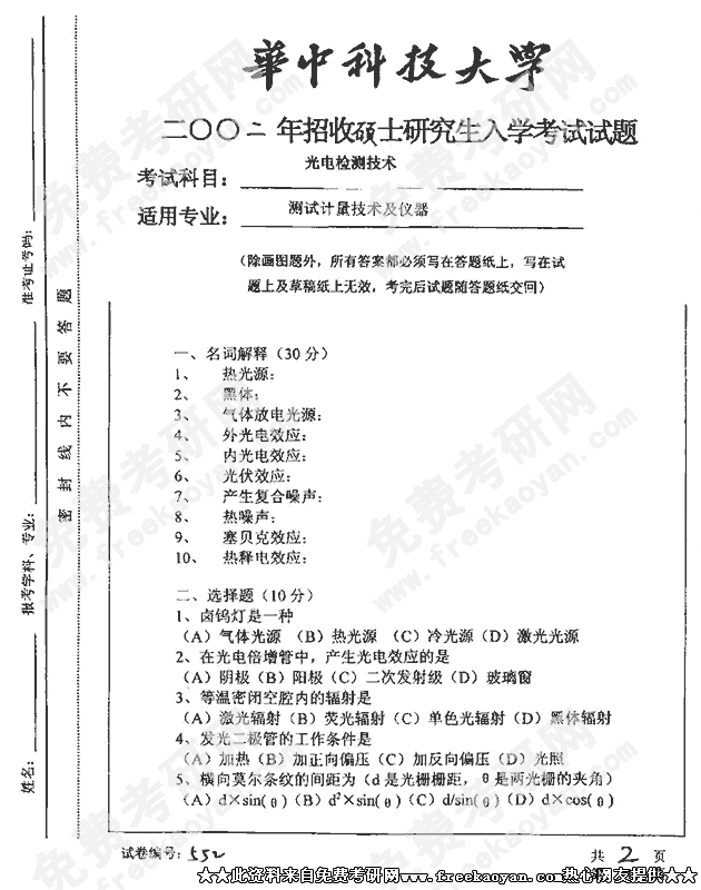 华中科技大学2002年半岛在线注册真题-光电检测技术