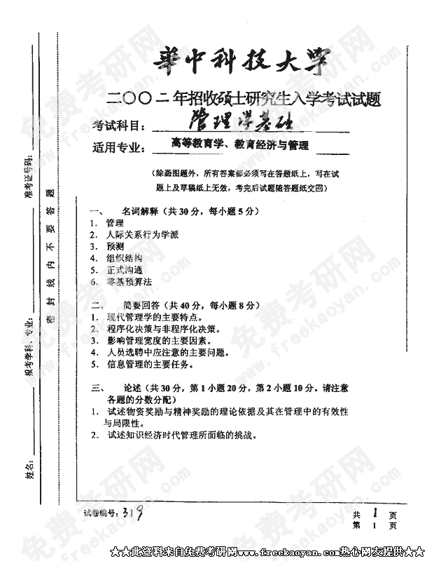华中科技大学2002年半岛在线注册真题-管理学基础