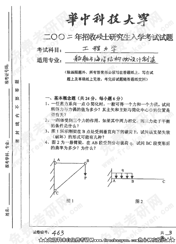 华中科技大学2002年半岛在线注册真题-工程力学B
